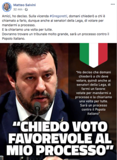 Il segretario del Carroccio ha poi pubblicato un post in cui ribadisce la sua richiesta. “Amici ho deciso. Sulla vicenda Gregoretti, domani chiederò a chi è chiamato a farlo, dunque anche ai senatori della Lega, di votare per mandarmi a processo. E la chiariamo una volta per tutte. Dovranno trovare un tribunale molto grande sarà un processo contro il Popolo italiano”.