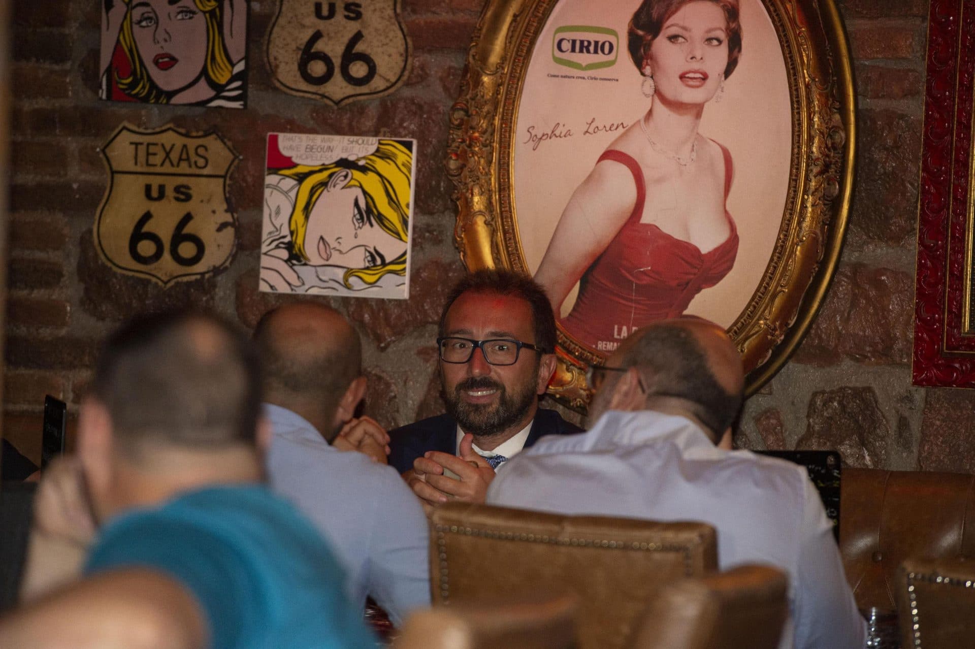 Un menu veloce, pizza, patatine, una birra e un doppio giro di amari. Al tavolo anche il socio di Rousseau Max Bugani e il fedelissimo Pietro Dettori. Bocche cucite a fine cena ma tanti sorrisi.