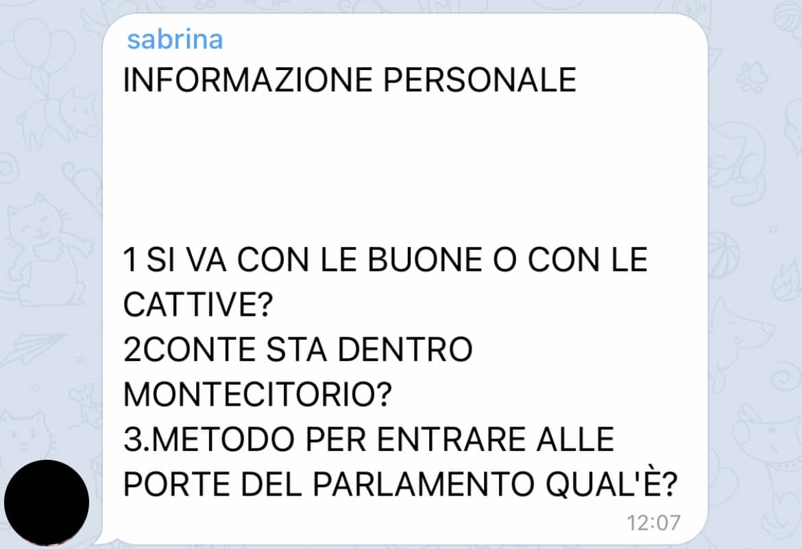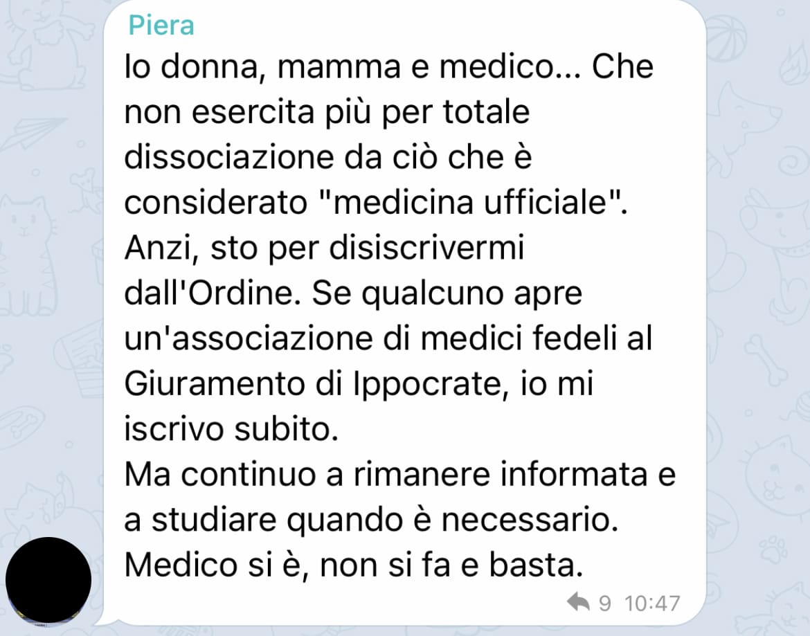 Su Facebook, sul gruppo “Uniti a dire no lock down” (ovviamente in maiuscolo) un’altra Sabrina scrive a caratteri cubitali: “non vi conosco e non so di dove siete… ma il 15 novembre alle 15 a Roma ci andate? Che si farà guerra contro la Polizia?” (106 like). Tornando su Telegram, arriva il messaggio di Alberto: “Il problema è che siamo pecore ed accettiamo tutto!!!! Questa è una dittatura….. si risolve solo con le armi ….. le manifestazioni pacifiche non servono!!!!! Abbiamo bisogno di chi comanda le forze di polizia, carabinieri ed esercito al nostro fianco….. appendere questi delinquenti che stanno terrorizzando il paese!!!”. E poi Piera: “Io donna, mamma e medico… Che non esercita più per totale dissociazione da ciò che è considerato ‘medicina ufficiale’. Anzi, sto per disiscrivermi dall’Ordine. Se qualcuno apre un’associazione di medici fedeli al Giuramento di Ippocrate, io mi iscrivo subito. Ma continuo a rimanere informata e a studiare quando è necessario. Medico si è, non si fa e basta”. Poco dopo, Marco posta un video girato col cellulare sul tavolo di una cucina che dimostrerebbe che facendo il test sierologico al vino rosso risulterebbe contagiato dal Covid. E ancora: Patrizia condivide un video del canale YouTube “Il decimo toro” in cui un uomo che inquadra solo la sua bocca esordisce con “Care amiche e cari amici, sono le 5.41 del mattino e ho appena concluso la prima preghiera. Accendo il computer e trovo una brutta notizia… Bergoglio, il falso Papa, benedice Biden, il falso Presidente…”.