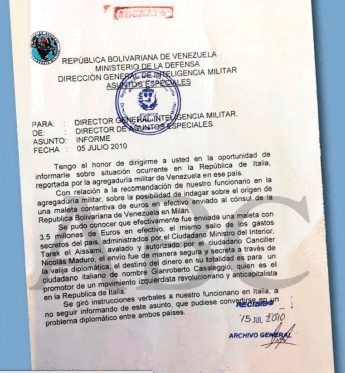 Il quotidiano spagnolo a riprova della fondatezza dell’informazione, pubblica un documento top secret dei servizi segreti militari venezuelani. I soldi nella valigetta – si legge nel documento – sono stati consegnati a “un cittadino italiano di nome Gianroberto Casaleggio, fondatore di un movimento rivoluzionario anticapitalista e di sinistra nella Repubblica italiana“.