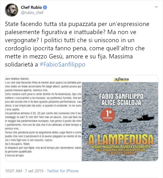 Chef Rubio esprime la sua solidarietà a Fabio Sanfilippo, il giornalista Rai che il 4 settembre scorso ha invitato Matteo Salvini al suicidio in un post su Facebook che in queste ore sta facendo molto discutere. “Tempo sei mesi e ti spari”, ha scritto il caporedattore di Radio Uno.