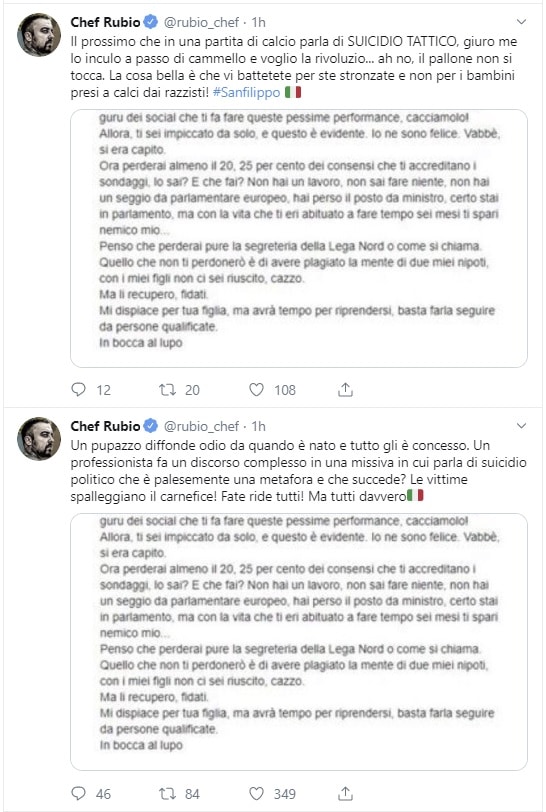 E ancora, ha continuato Chef Rubio in un altro tweet: “Un pupazzo diffonde odio da quando è nato e tutto gli è concesso. Un professionista fa un discorso complesso in una missiva in cui parla di suicidio politico che è palesemente una metafora e che succede? Le vittime spalleggiano il carnefice! Fate ride tutti! Ma tutti davvero”.