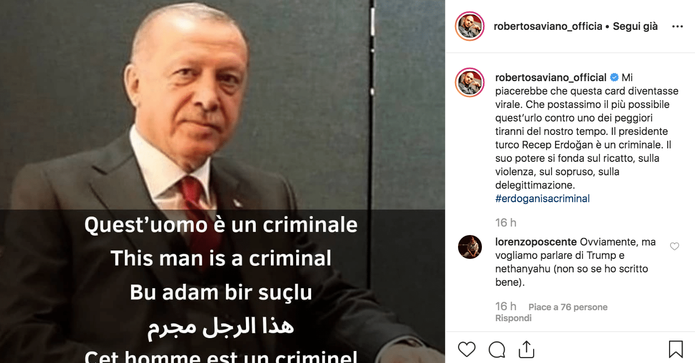 “Mi piacerebbe che questa card diventasse virale. Che postassimo il più possibile quest’urlo contro uno dei peggiori tiranni del nostro tempo”, scrive lo scrittore, condividendo su Instagram un’immagine del presidente turco. “Il presidente Recep Erdoğan è un criminale. Il suo potere si fonda sul ricatto, sulla violenza, sul sopruso, sulla delegittimazione”.