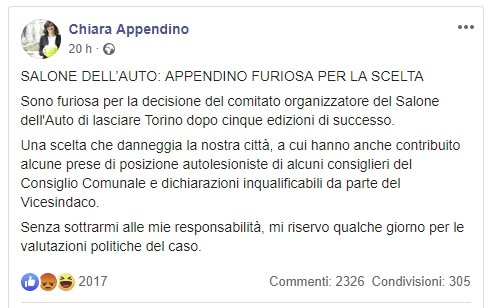 Appendino ha criticato la decisione del Salone dell’auto ma si è scagliata anche contro stretti collaboratori. La prima cittadina si è detta “furiosa” per una scelta degli organizzatori che “danneggia la città” e ha attaccato i consiglieri della sua maggioranza e il vicesindaco con delega all’Urbanistica Guido Montanari, accusati di “autolesionismo” e “dichiarazioni inqualificabili”.