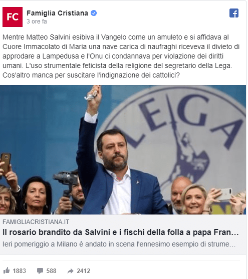 Chiesa contro Salvini | “Il rosario brandito da Salvini e i fischi della folla a Papa Francesco, ecco il sovranismo feticista”. Famiglia Cristiana colpisce duro il ministro dell’Interno, Matteo Salvini, con un editoriale sulla manifestazione della Lega, tenutasi a Milano sabato 18 maggio.
