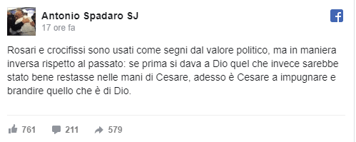Il post di Spadaro – Anche padre Antonio Spadaro, direttore della Civiltà Cattolica, aveva espresso questa mattina il suo risentimento via Facebook: “Rosari e crocifissi in politica, i cristiani si indignino”, si legge nel suo profilo. “Sono credente, è mio dovere è salvare le vite umane”, ha replicato del vicepremier leghista.