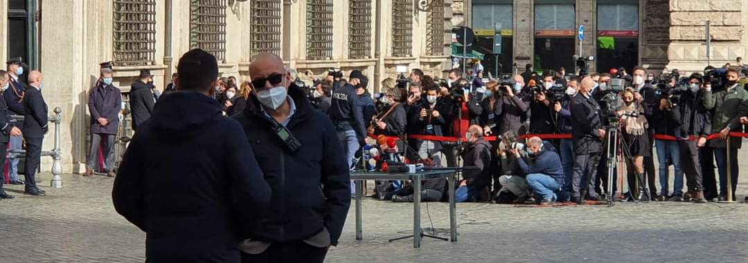 Ad organizzare il tutto, il portavoce di Conte, Rocco Casalino: “Non vi assembrate, eh”, avverte parlando ai cronisti e facendoli accomodare dietro a un cordone per tenerli a distanza dall’ex premier. “E non inquadrate Palazzo Chigi, non è una cosa istituzionale”, dice Casalino. Troppo tardi, l’assembramento era già in corso.