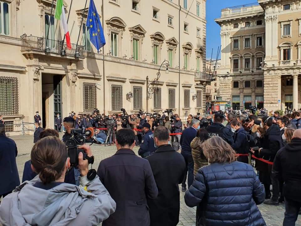 Mega-assembramento di giornalisti e cameramen per la conferenza di Conte davanti a Palazzo Chigi | FOTO