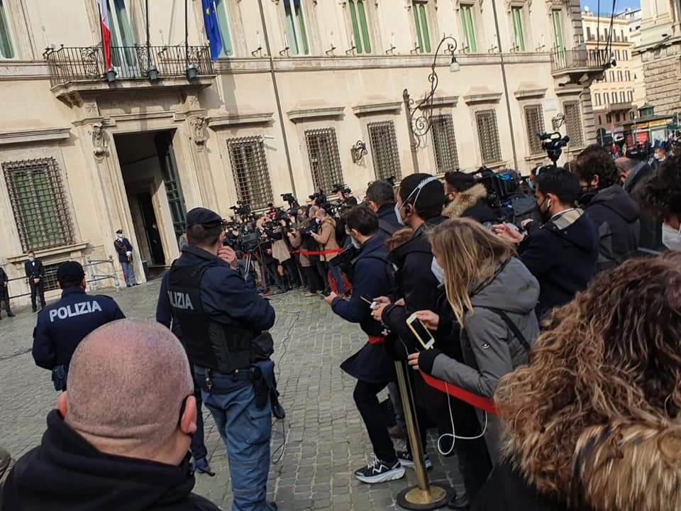 Al contrario, è stato preparato un minuscolo tavolino all’aperto, in mezzo a Piazza Colonna e nell’inquadratura non c’era Chigi, ma Montecitorio, come a voler già indicare le consultazioni tra Mario Draghi e le forze politiche che sono iniziate subito dopo la conferenza, alle 15,30.