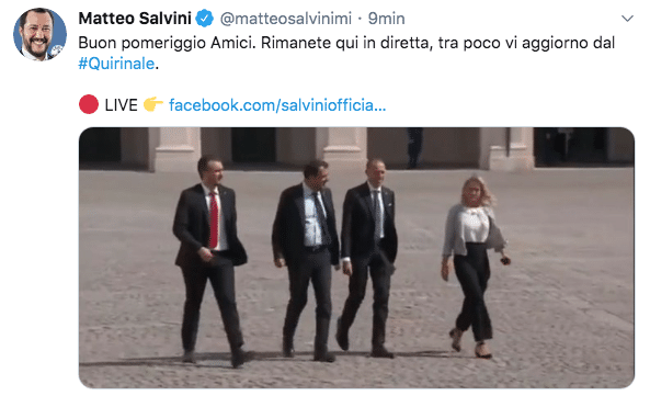ore 16.40 – Il leader della Lega, Matteo Salvini, parla al termine del colloquio avuto con il presidente Mattarella: “Bella discussione. Sono contento di rappresentare una forza politica compatta che prenderà decisioni nell’interesse del paese. Abbiamo scelto di portare nelle case degli italiani i problemi che qualche vecchia politica avrebbe tenuto chiusi nelle stanze fino a qualche legislatura fa”.