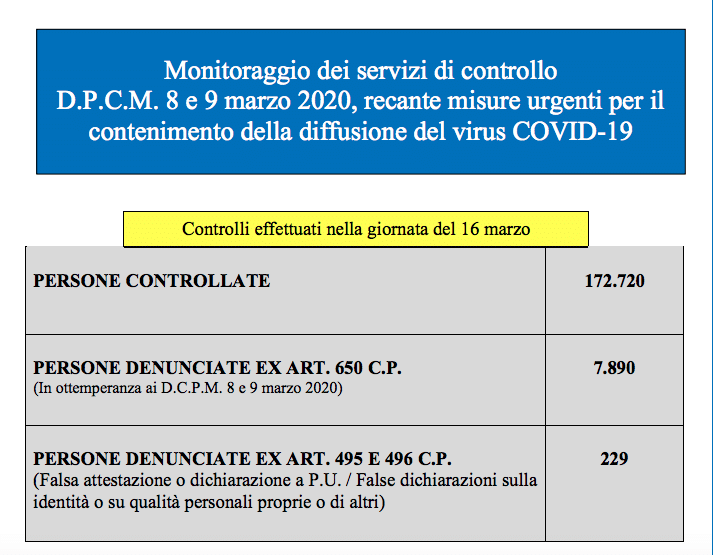 Sempre ieri, le persone complessivamente controllate in tutta Italia sono state 172.720, quelle denunciate per “falsa attestazione o dichiarazione a pubblico ufficiale” o “false dichiarazioni sulla identità o su qualità personali proprie o di altri” 229. Dall’11 marzo, giorno di entrata in vigore dell’ultimo decreto che impone il divieto di spostarsi, ad oggi, sono state denunciate in tutto 27.616 persone su un totale di 665.480 controlli effettuati.