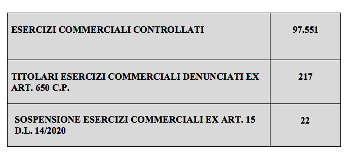 Anche nell’ambito delle attività commerciali, una buona percentuale di esercenti resiste ai divieti imposti dal governo: gli esercizi controllati lunedì 16 marzo sono stati 97.551, e di questi i titolari denunciati ai sensi dell’articolo 650 del codice penale 217, 97 in più rispetto a domenica. Per 22 esercizi commerciali è stata disposta la sospensione.