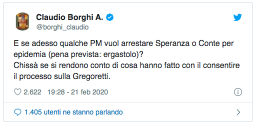 In un post sul suo attivissimo profilo Twitter, il deputato del Carroccio si chiede se i pm, viste l’emergenza e i casi di contagio da Coronavirus tra Lombardia e Veneto, abbiano intenzione di denunciare per “epidemia” il presidente del Consiglio Giuseppe Conte e il ministro della Salute Roberto Speranza.