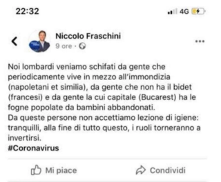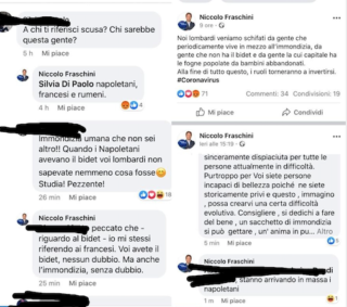 “Da queste persone non accettiamo lezione di igiene: tranquilli, alla fine di tutto questo, i ruoli torneranno a invertirsi”, ha scritto Fraschini riferendosi all’epidemia di coronavirus scoppiata nel nord Italia.