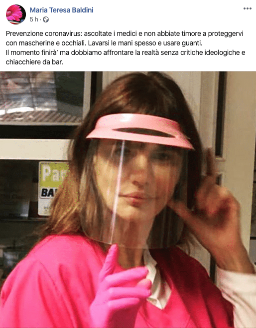 Poche ore prima, sul suo profilo Facebook, la Baldini aveva pubblicato una foto che la ritrava con una sorta di casco protettivo: “Prevenzione Coronavirus: ascoltate i medici e non abbiate timore a proteggervi con mascherine e occhiali. Lavarsi le mani spesso e usare guanti. Il momento finirà ma dobbiamo affrontare la realtà senza critiche ideologiche e chiacchiere da bar” scriveva la deputata di Fratelli d’Italia sui social.