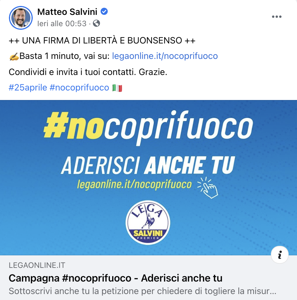 Nella giornata di domenica 25 aprile, il leader della Lega, Matteo Salvini, ha lanciato una petizione online per abolire il coprifuoco, che resta in vigore anche nel nuovo decreto anti-Covid in vigore da oggi, lunedì 26 aprile 2021.