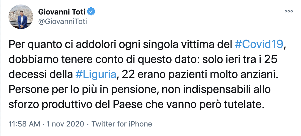 Covid, in Liguria ieri 25 morti: “Ma 22 erano anziani e non indispensabili alla produttività del Paese”. Disse Giovanni Toti, governatore della seconda Regione più anziana d’Europa
