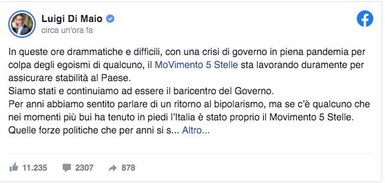 Sia, su Facebook, ha commenta il ministro degli Esteri, Luigi Di Maio: “In queste ore siamo al lavoro per un consolidamento della maggioranza, un processo complicato e ambizioso allo stesso tempo, perché il Paese ha bisogno di ricominciare a correre: le imprese devono lavorare, le famiglie hanno il diritto di poter pianificare il loro futuro. Ma – aggiunge – con la stessa forza con cui abbiamo preso decisioni forti in passato, ora mi sento di dire che mai il M5s potrà aprire un dialogo con soggetti condannati o indagati per mafia o reati gravi”.