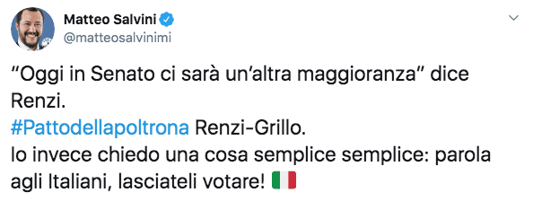 17.30 – Salvini risponde a Renzi: “Lasciate votare gli italiani”. “’Oggi in Senato ci sarà un’altra maggioranza’ dice Renzi. Patto della poltrona Renzi-Grillo. Io invece chiedo una cosa semplice semplice: parola agli Italiani, lasciateli votare”. Lo scrive il leader della Lega, Matteo Salvini, su Twitter.