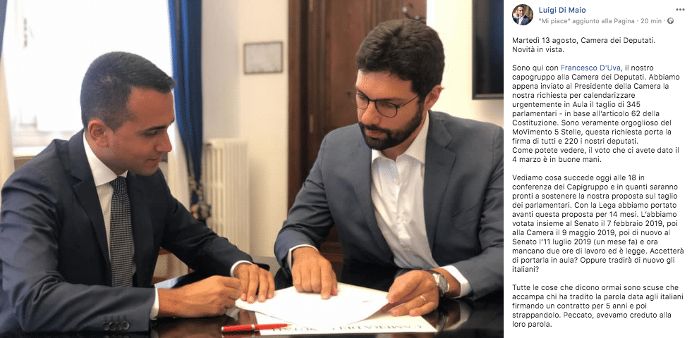 19.26: Di Maio: “La Lega ha ceduto sul taglio dei parlamentari. “Voglio darvi una buona notizia, dopo le proteste dei cittadini nelle piazze e sui social la Lega ha ceduto sul taglio dei parlamentari, una riforma del MoVimento 5 Stelle e che il Paese aspetta da anni. Settimana prossima tagliamo 345 parlamentari”. Così Luigi Di Maio in un post dove rilancia: “ho sentito dire ai leghisti, in un momento di euforia, che taglieranno anche gli stipendi dei parlamentari”. Dunque,”facciamolo subito. In ufficio di presidenza della Camera abbiamo ancora la maggioranza”.