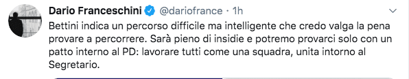 09.45 – Franceschini: “Vale la pena provare la strada indicata da Bettini”.“Bettini indica un percorso difficile ma intelligente che credo valga la pena provare a percorrere. Sarà pieno di insidie e potremo provarci solo con un patto interno al Pd: lavorare tutti come una squadra, unita intorno al segretario”. Lo scrive su Twitter Dario Franceschini, facendo riferimento alla proposta di Goffredo Bettini di un governo di legislatura.