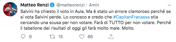 13.30 – Renzi definisce Salvini “Capitan Fracassa”. “Salvini ha chiesto il voto in Aula. Ma è stato un errore clamoroso perché se si vota Salvini perde. Lo conosco e credo che Capitan Fracassa stia cercando una scusa per non votare. Farà di tutto per non votare. Perché il tabellone dei risultati di oggi gli farà molto male. Molto”. Lo ha scritto in un tweet l’ex segretario del Pd Matteo Renzi.