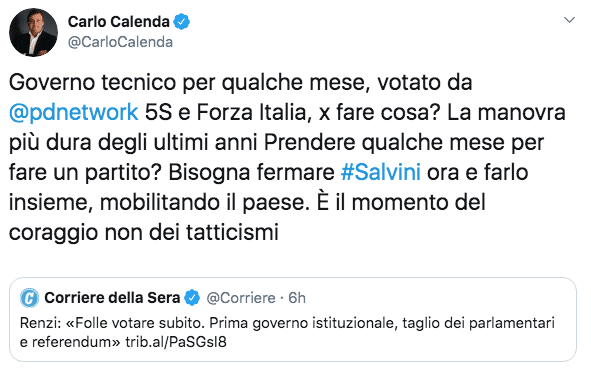 “Governo tecnico per qualche mese, votato da Pd, 5S e Forza Italia, per fare cosa? La manovra più dura degli ultimi anni. Prendere qualche mese per fare un partito? Bisogna fermare Salvini ora e farlo insieme, mobilitando il paese. È il momento del coraggio, non dei tatticismi”, twitta invece Calenda.
