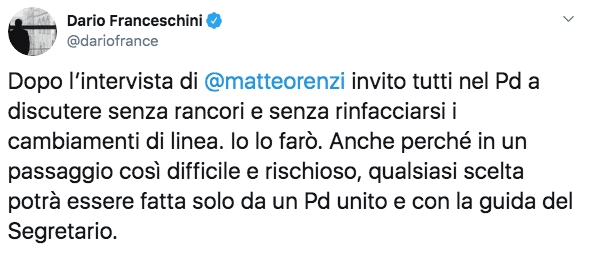 “Dopo l’intervista di Matteo Renzi invito tutti nel Pd a discutere senza rancori e senza rinfacciarsi i cambiamenti di linea. Io lo farò. Anche perché in un passaggio così difficile e rischioso, qualsiasi scelta potrà essere fatta solo da un Pd unito e con la guida del segretario”, scrive su Twitter Franceschini.