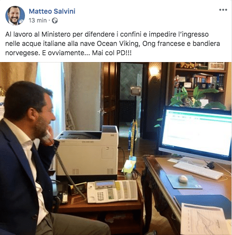 “Al lavoro al Ministero per difendere i confini e impedire l’ingresso nelle acque italiane alla nave Ocean Viking, Ong francese e bandiera norvegese. E ovviamente… Mai col PD!!!” si legge nella didascalia.