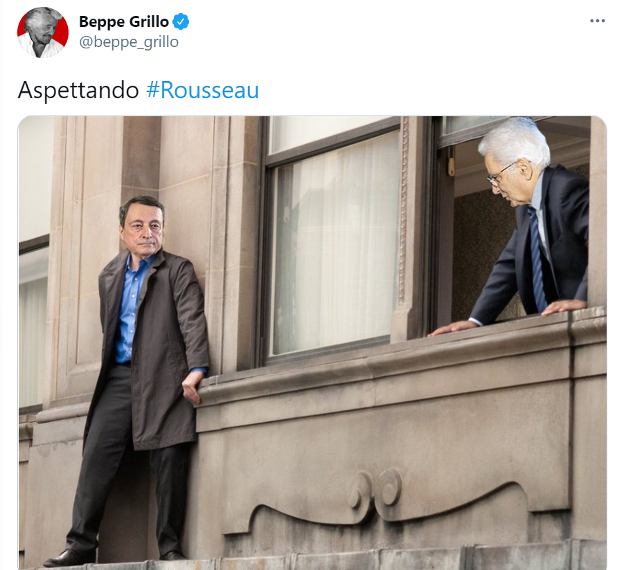 Ore 16,30 – Il fotomontaggio di Grillo: Draghi sul cornicione – Il fondatore M5S Beppe Grillo ha pubblicato un fotomontaggio nel quale mostra Mario Draghi in bilico su un cornicione e Mattarella che lo osserva da una finestra. Didascalia a corredo dell’immagine: “Aspettando Rousseau”. Il riferimento è all’sito della consultazione online del M5S che sarà determinante per il cammino del nuovo esecutivo. Il voto è aperto fino alle 18.