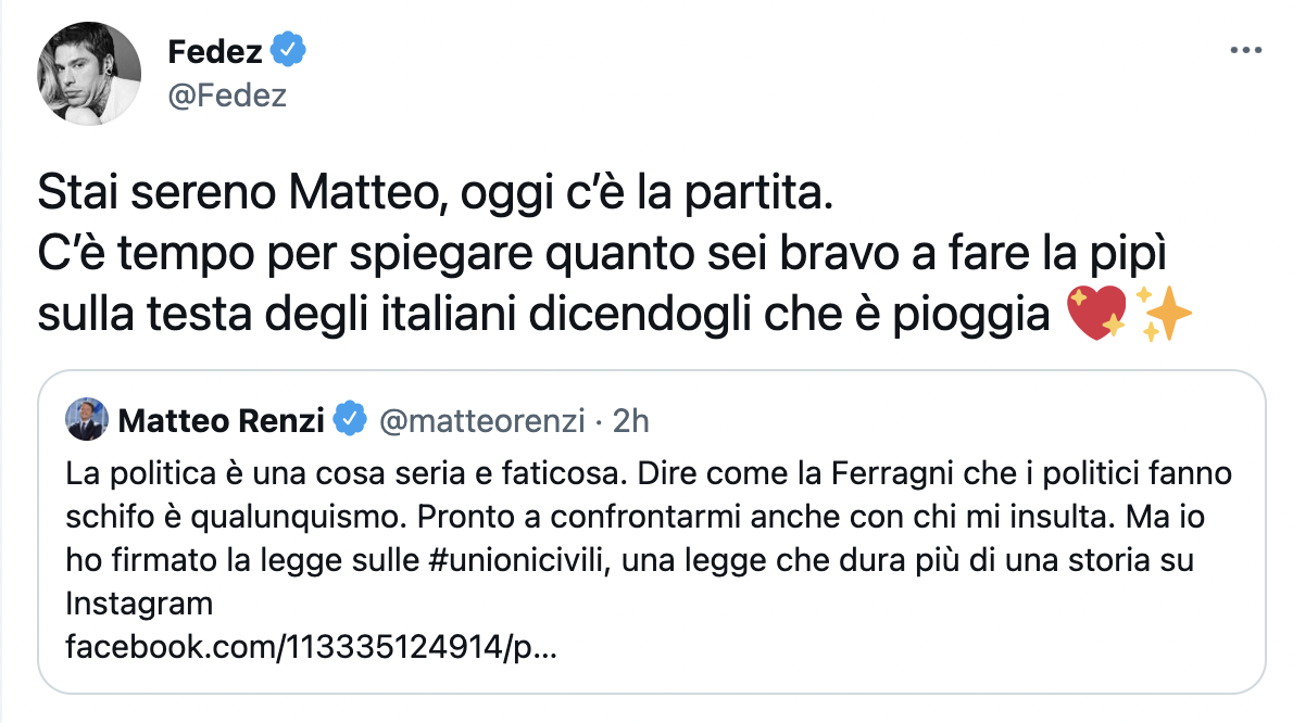 “Stai sereno Matteo, oggi c’è la partita. C’è tempo per spiegare quanto sei bravo a fare la pipì sulla testa degli italiani dicendogli che è pioggia” ha scritto il cantante, rispondendo al post dell’ex presidente del Consiglio.