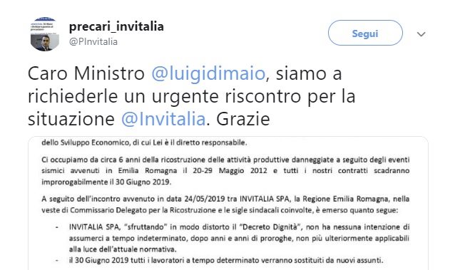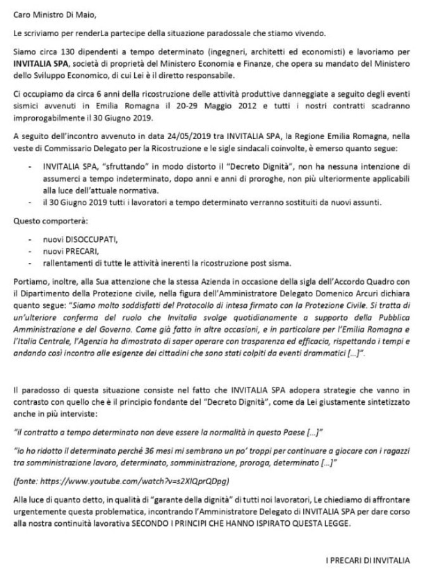 “Dicono che i nostri contratti non possono essere prorogati per colpa del Decreto Dignità. Qualcuno ci dovrebbe spiegare il senso di questa affermazione, perché non c’è alcuna norma che impedisca a un’azienda di stabilizzare un lavoratore che per anni ha dimostrato di lavorare bene ed è sempre stato rinnovato. Con il mancato rinnovo dei nostri contratti, verremo sostituiti con nuovi lavoratori che non hanno esperienza nel nostro specifico campo; questo comporterà, con ogni probabilità, ritardi nell’erogazione dei contributi già stanziati e difficoltà nella gestione di specifiche problematiche che caratterizzano il processo di ricostruzione in Emilia e che, inevitabilmente, si andranno ad abbattere sulle imprese beneficiarie danneggiate dal sisma, sulle imprese esecutrici e sui fornitori. Noi stiamo intraprendendo un confronto attraverso canali sindacali e aziendali ma non stiamo avendo risposte. Invitalia in Emilia non vuole stabilizzarci, preferendo procedere con nuove assunzioni. Loro riportano la questione al decreto Dignità, ma il Decreto Dignità dice solamente che dopo una serie di proroghe il lavoratore andrebbe stabilizzato e non continuamente rinnovato a termine”.