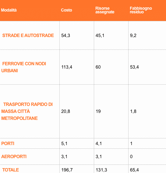 Inoltre, sono 36 le opere commissariate e elencate nel piano di infrastrutture messo a punto dal Mit. Si tratta di 12 opere idriche (dighe o acquedotti) di nuova realizzazione o di messa in sicurezza, 15 opere ferroviarie (valico di Giovi, Napoli-Bari, Roma-Pescara e via dicendo) e 9 infrastrutture stradali come la Grosseto-Fano, la Roma-Latina, la SS106 Ionica e la Tarquinia San Pietro in Palazzi. Il piano al quale il Mit stava già lavorando risulta già finanziato per oltre 130 miliardi.