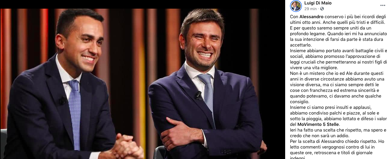 “Insieme abbiamo portato avanti battaglie civili e sociali, abbiamo promosso l’approvazione di leggi cruciali che permetteranno ai nostri figli di vivere una vita migliore”, prosegue Di Maio. “Non è un mistero che io ed Ale durante questi anni in diverse circostanze abbiamo avuto una visione diversa, ma ci siamo sempre detti le cose con franchezza ed estrema sincerità e quando potevamo, ci davamo anche qualche consiglio. Insieme ci siamo presi insulti e applausi, abbiamo condiviso palchi e piazze, al sole e sotto la pioggia, abbiamo lottato e difeso i valori del MoVimento 5 Stelle”, ha aggiunto.