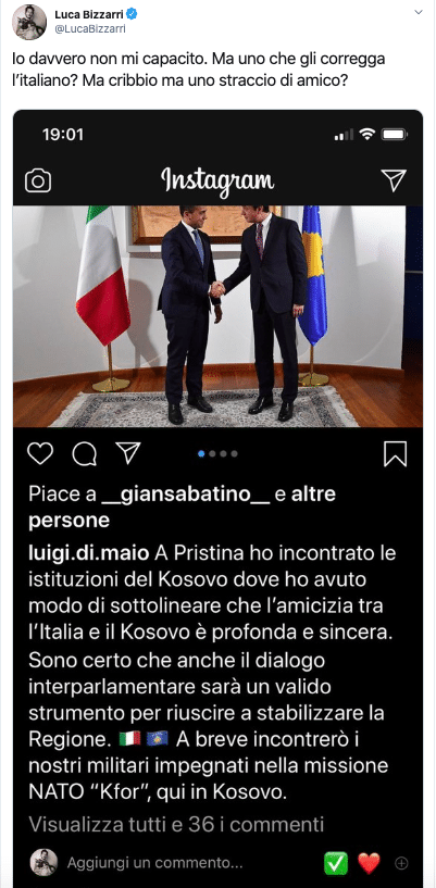 “Io davvero non mi capacito. Ma uno che gli corregga l’italiano? Ma cribbio ma uno straccio di amico?” ha scritto l’attore sul suo profilo Twitter in cui ha allegato una foto che Di Maio aveva postato poco prima sul suo profilo Instagram nel quale parlava di un incontro che aveva avuto in Kosovo e che, secondo Bizzarri, non era scritto in un perfetto italiano.