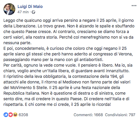 Il 25 aprile oltre a “dividere” nostalgici fascisti da cittadini antifascisti, sta dividendo anche la maggioranza di governo. Di Maio ha attaccato Salvini: “Leggo che qualcuno oggi arriva persino a negare il 25 aprile, il giorno della Liberazione. Lo trovo grave”, ha detto Di Maio in un post su Facebook.