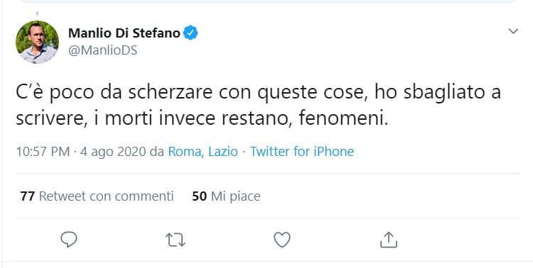 Di Stefano ha quindi deciso di cancellare il post, ma ormai era troppo tardi. Gli screenshot della gaffe hanno invaso i social. E il politico, non pago, qualche ora dopo ha commesso un altro errore: anziché chiedere scusa il sottosegretario ha risposto ai suoi follower attaccandoli: “C’è poco da scherzare con queste cose, ho sbagliato a scrivere, i morti invece restano. Fenomeni”. Una replica, quella del grillino, che ha moltiplicato i tweet critici nei suoi confronti.
