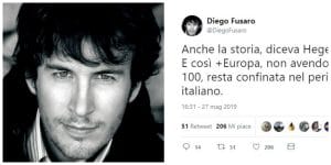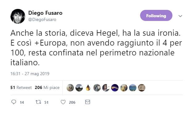 “Anche la storia, diceva Hegel, ha la sua ironia. E così +Europa, non avendo raggiunto il 4 per 100, resta confinata nel perimetro nazionale italiano”. Diego Fusaro commenta così la sconfitta di +Europa e della sua leader Emma Bonino alle elezioni per il rinnovo del Parlamento europeo del 26 maggio.