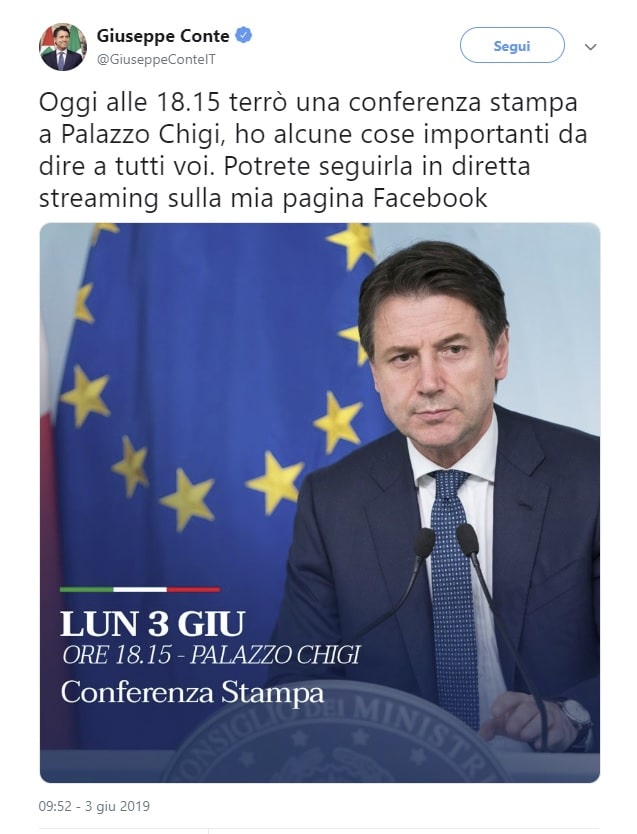 Il premier del Consiglio ha annunciato la conferenza stampa di oggi, 3 giugno, in un momento di particolare crisi tra gli alleati di Governo. Da giorni i rapporti tra il vicepremier leghista e l’omologo 5 Stelle sono molto tesi, con la Lega che continua a parlare di elezioni anticipate.