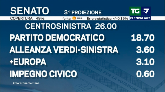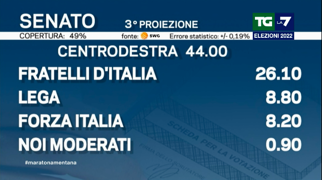 Ore 0,10 – Prima proiezione Swg – La prima proiezione di Swg per il TgLa7 sul Senato vede il centrodestra al 43,30%, il centrosinistra al 25,40%, il Movimento 5 Stelle al 17 per cento, Azione-Italia Viva al 7,90%, Italexit all’1,70 per cento e Unione Popolare all’1,40 per cento. Secondo la proiezione, Fdi sarebbe il primo partito con il 26%, seguito dal Pd al 18,10 per cento e dal M5S al 17%. La Lega sarebbe all’8,40%, Forza Italia e il Terzo Polo (Azione e Italia Viva) entrambi al 7,90 per cento, Verdi-Sinistra al 3,60%, +Europa al 3,10 per cento, Noi Moderati all’1 per cento e Impegno Civico allo 0,60 per cento. Qui tutte le proiezioni.