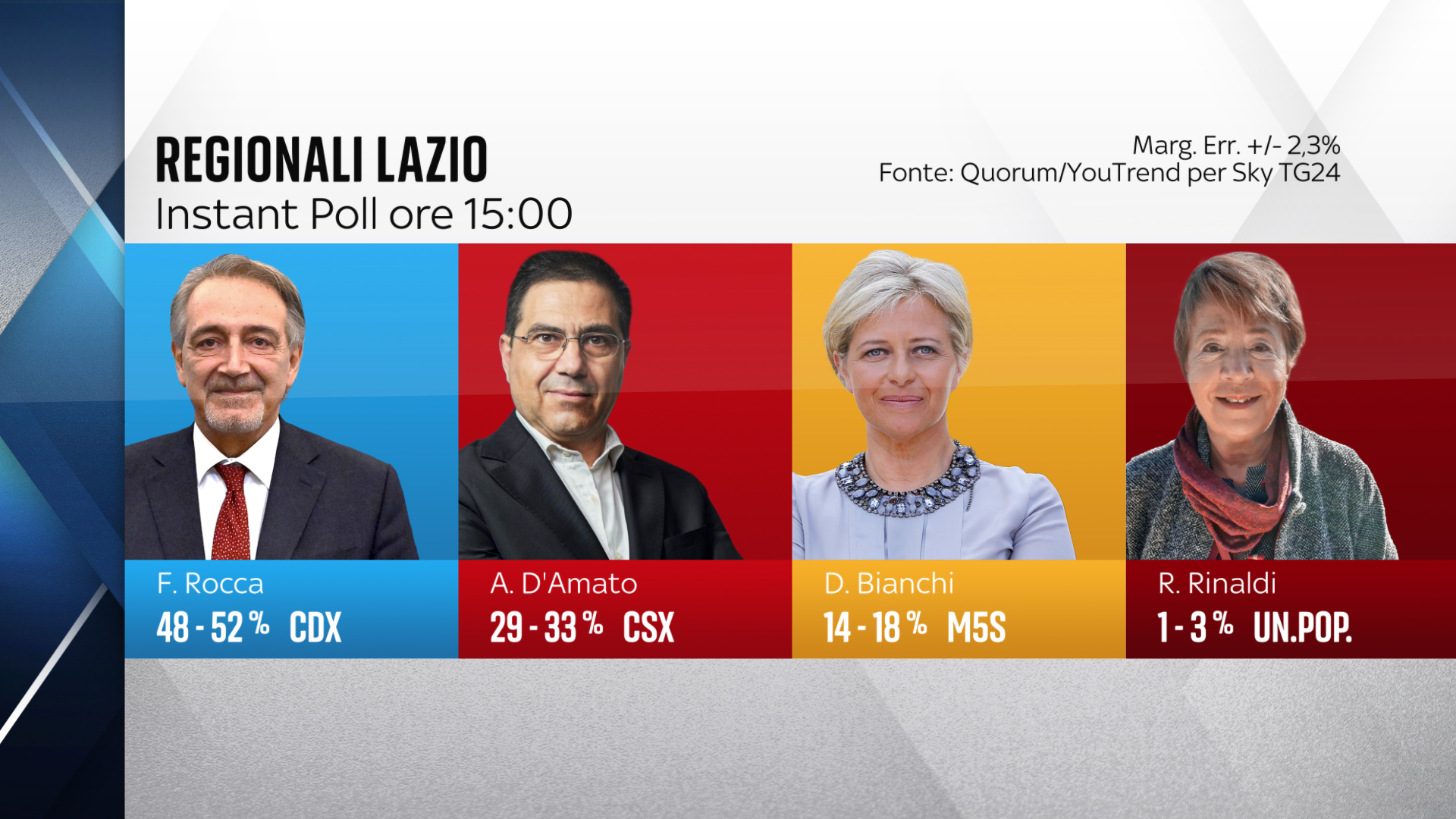 Ore 16,42 – Lazio, prima proiezioni Opinio Rai: Rocca al 52%, D’Amato al 34, Bianchi al 10,6% – Secondo le prime proiezioni realizzate dal Consorzio Opinio Italia per la Rai (copertura pari al 5%) Francesco Rocca, candidato del centrodestra alla presidenza della Regione Lazio, è avanti con il 52,1% delle preferenze. Segue lo sfidante di centrosinistra, Alessio D’Amato, con il 34,7%. Al 10,6% l’esponente del Movimento 5 stelle, Donatella Bianchi, mentre Rosa Rinaldi di Unione Popolare ha una percentuale dell’1,4%.