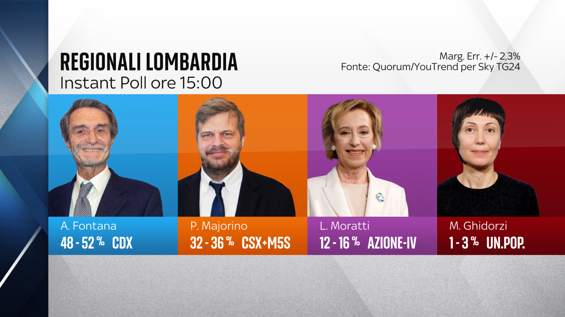 In Lombardia la sfida è tra il governatore uscente Attilio Fontana, candidato del centrodestra, Pierfrancesco Majorino, candidato di Pd, M5S, Sinistra Italiana/Verdi e Letizia Moratti, appoggiata dal Terzo Polo.