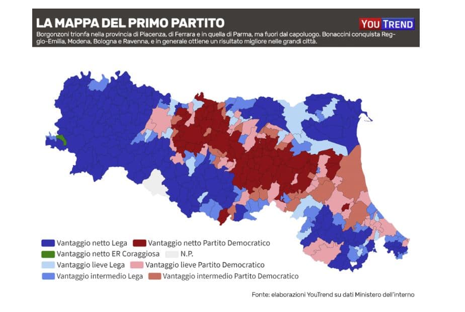 Come sottolineato dalla stessa Borgonzoni questa mattina, la Lega non è riuscita a intercettare il voto delle grandi città. Quelle, per intenderci, con il più grande bacino di elettori. Borgonzoni ha invece trionfato nelle province di Piacenza, Ferrara e Parma.