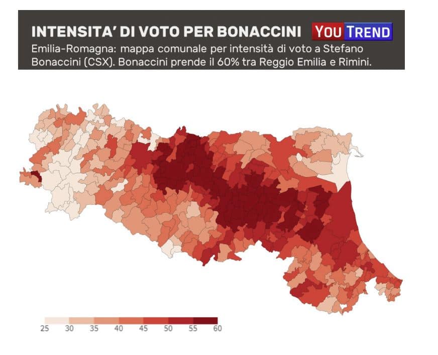 Il governatore uscente dell’Emilia-Romagna, Stefano Bonaccini, ha vinto le elezioni regionali di ieri sconfiggendo con largo margine la candidata leghista Lucia Borgonzoni: per capire ancora meglio la portata di questi risultati può essere utile consultare la mappa del voto, realizzata da YouTrend, con i dati città per città.