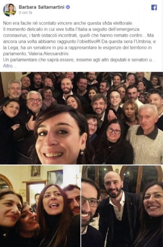 La notizia ha fatto il giro del web soprattutto perché la deputata leghista Barbara Saltamartini ha pubblicato un post – poi rimosso – sulla sua pagina Facebook con tanto di foto dei festeggiamenti. “Non era facile né scontato vincere anche questa sfida elettorale – scriveva la parlamentare del Carroccio – ma ancora una volta abbiamo raggiunto l’obiettivo, nonostante il momento delicato in cui vive tutta l’Italia a seguito dell’emergenza Coronavirus”.
