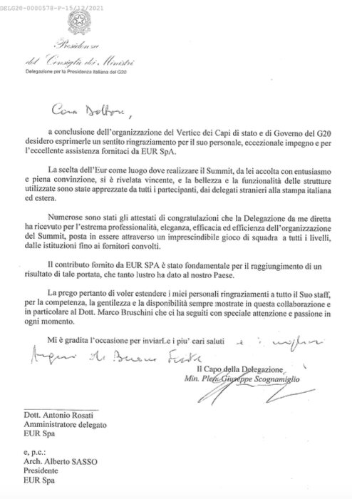 Andiamo ai fatti: ieri l’assemblea dell’azienda, controllata al 90% dal Mef e per il restante 10% da Roma Capitale, è stata rinviata per la ventiduesima volta (22!), perché non si è trovato l’accordo sul nuovo assetto del Cda, ormai scaduto da tempo. L’attuale amministratore delegato, Antonio Rosati, nominato a luglio del 2020 dopo le dimissioni di Enrico Pazzali, ha svolto un lavoro da più parti definito come inappuntabile: grazie alla collaborazione di Giuseppe Ciccarone, prorettore vicario della Sapienza, ha dotato l’azienda di un piano industriale efficiente (richiesto come case history dall’Università di Oxford) dopo anni di gestione distratta da parte dell’ex Ad, contemporaneamente impegnato alla Fiera di Milano; ha prima fatto collaudare (ebbene sì, non era collaudata) e poi rivitalizzato la Nuvola di Fuksas (che se n’è pubblicamente rallegrato), riconsegnandola ai romani prima come funzionale hub vaccinale inaugurato da Mattarella (460.000 persone inoculate), poi come teatro di attività culturali frequentatissime (100.000 visitatori per “Più libri più liberi”) e di primo livello (su tutte il concerto di Patti Smith); ha varato il progetto e i bandi di gara per dotare la creatura di Fuksas di un bookshop e di un ristorante stellato, sul modello del Beaubourg parigino; ha ospitato il G20 ricevendo al termine un’entusiasta lettera di complimenti da parte della Farnesina (che Tpi pubblica in esclusiva); ha stretto accordi con l’istituto del credito sportivo per accedere a finanziamenti volti alla valorizzazione delle strutture; ha salvato dal fallimento Luneur, lo storico parco divertimenti, oggi trasformata in locazione da concessione, incassando 1 milione di euro di arretrati; ha fatto studiare e poi risolto le criticità che affliggevano l’acquario che da 15 anni aspetta di sorgere sotto al laghetto dell’Eur e che finalmente aprirà a Natale del 2022; ha raggiunto il tasso record di locazione del 97% degli immobili in gestione; ha, insomma, avviato una vera e propria rinascita del patrimonio monumentale, architettonico e culturale del quartiere di Roma Sud che è “particolarmente rilevante” (Gualtieri dixit).
