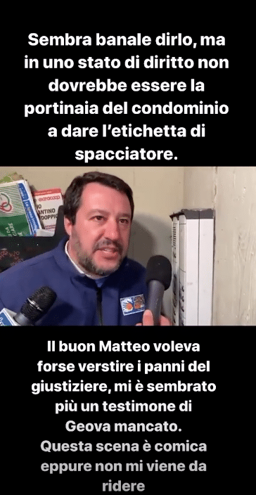 “Sembra banale dirlo, ma in uno stato di diritto non dovrebbe essere la portinaia del condominio a dare l’etichetta di spacciatore. Il buon Matteo forse voleva vestire i panni del giustiziere, mi è sembrato più un testimone di Geova mancato“, continua Fedez sui social.