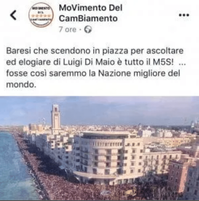 In tanti hanno creduto che i cittadini di Bari si fossero davvero radunati sul lungomare per il comizio di Luigi Di Maio, ma l’equivoco è stato presto segnalato da alcuni utenti che hanno spiegato come la foto fosse stata scattata in occasion della festa patronale di San Nicola.