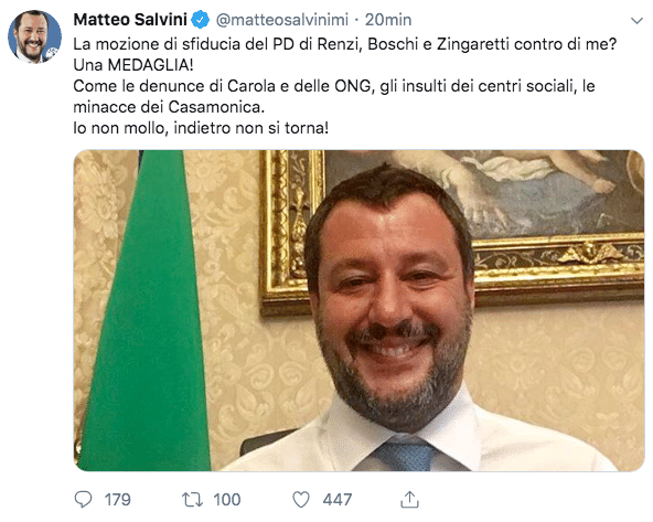 Ma il vicepremier Salvini non sembra preoccupato all’idea di affrontare una mozione di sfiducia. “La mozione di sfiducia del Pd di Renzi, Boschi e Zingaretti contro di me? Una MEDAGLIA! Come le denunce di Carola e delle ONG, gli insulti dei centri sociali, le minacce dei Casamonica. Io non mollo, indietro non si torna!”. scrive Salvini su Twitter.