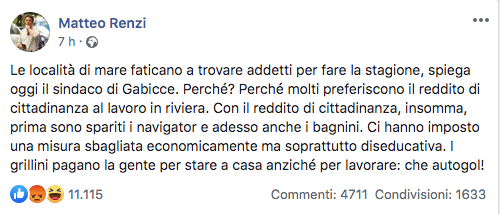 L’appello del sindaco Pascuzzi è stato accolto e rilanciato anche dall’ex presidente del Consiglio Matteo Renzi, che in un tweet pubblicato nella mattinata dell’8 giugno ha sostenuto: “Le località di mare faticano a trovare addetti per fare la stagione, spiega oggi il sindaco di Gabicce. Perché? Perché molti preferiscono il reddito di cittadinanza al lavoro in riviera. Con il reddito di cittadinanza, insomma, prima sono spariti i navigator e adesso anche i bagnini. Ci hanno imposto una misura sbagliata economicamente ma soprattutto diseducativa. I grillini pagano la gente per stare a casa anziché per lavorare: che autogol!”.